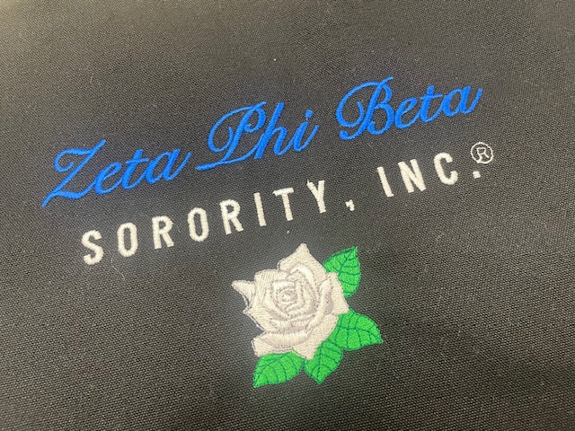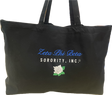 This tote is embroidered with your Sorority in an elegant script font and an added symbol below for added appeal and pop!