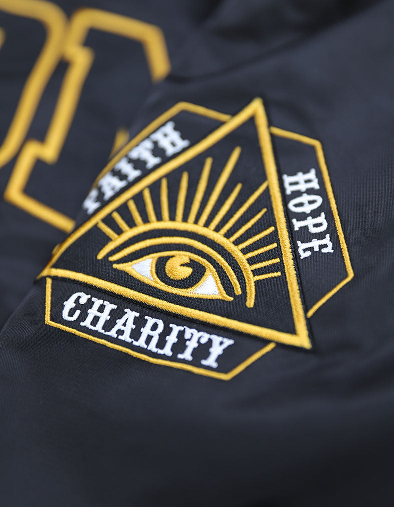 Our Standard Fit Bomber Jacket is one of our best sellers. It is lightweight, comfortable, and perfect to wear in cold weather. The outer shell is waterproof and the inside has a 100% satin polyester lining. The jacket features a full length front zip closure, two front slash pockets with flap & snap closure, a zippered utility pocket, an interior slip pocket, rib-knitted cuff, collar, and hem. Embroidered patches on both sleeves, chest, and back completes this one of a kind look.